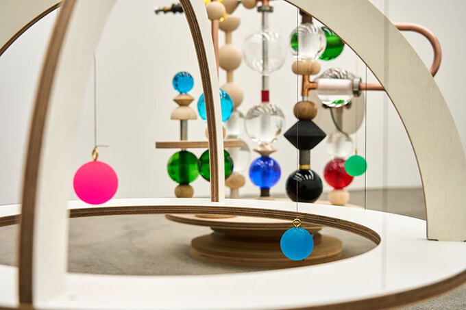 오색 빛깔을 머금은 유리구슬과 고운 나무로 매끈하게 빚어낸 갖가지 둥근 형태들. 낙하 중의 물방울처럼 모난 데 없는 유리구의 형태를 중심 삼아 다양한 입체도형들이 공간 안에 배열된다. 가느다란 지지체에 중심축을 내어준 채, 한 몸으로 꿰어진 구슬과 원뿔대들은 주어진 중력에 따라 바닥으로부터 상승하거나 천장에서부터 하강한다.