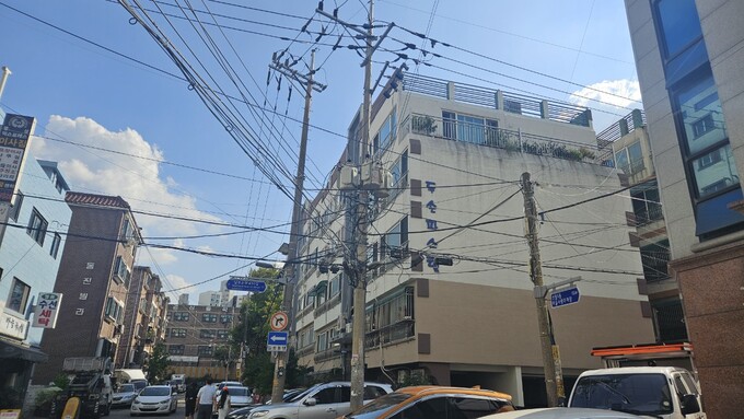 서울 양천구가 연말까지 정비하겠다고 밝힌 신월동 일대의 공중케이블이 거미줄처럼 얽혀 있는 모습. 양천구 제공