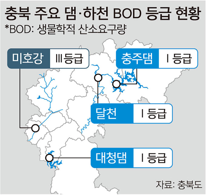 BOD 1등급으로 수도권에 식수를 공급하는 충주댐과 충청지역 주요 수원인 대청댐도 수질오염에서 자유롭지 않다. 녹조 발생 등 수질 개선이 필요하다. 이들 댐은 7, 8월 장마철 비로 인해 논과 밭, 도로 등에서 오염원이 한꺼번에 쏟아져 녹조가 발생한다. 이들 지류와 하천에선 BOD 2등급(리터당 2~3㎎)과 3등급(3~5㎎/ℓ)인 지점도 많다.