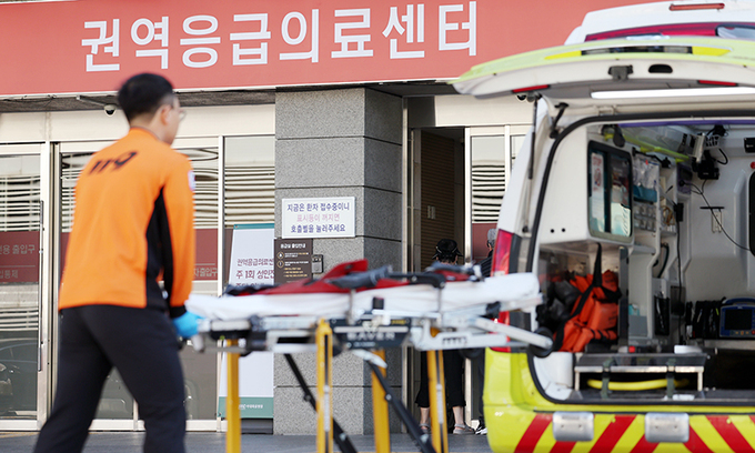 정부의 의대 정원 확대에 반발하는 전공의들을 비롯한 의료계의 집단행동이 장기화 되고 있는 4일 서울의 한 대학병원 응급의료센터에서 구급대원들이 환자를 이송하고 있다. 뉴스1