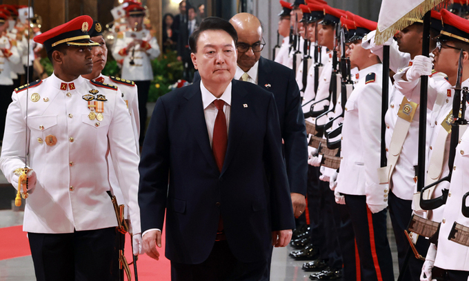 싱가포르를 국빈 방문한 윤석열 대통령이 8일(현지시간) 싱가포르 의회에서 열린 공식환영식에서 타르만 샨무가라트남 싱가포르 대통령과 의장대를 사열하고 있다. 뉴시스