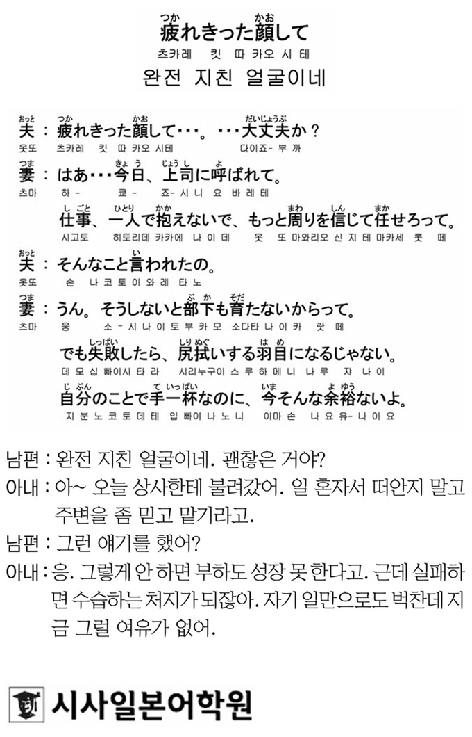 [시사일본어학원의 초단기 일본어 회화] 완전 지친 얼굴이네 입력 : 2024-10-08 18:17:20 수정 : 2024-10-08 18:17:19 구글 네이버 유튜브 Copyright ⓒ 세계일보. 무단 전재 및 재배포 금지 세계일보