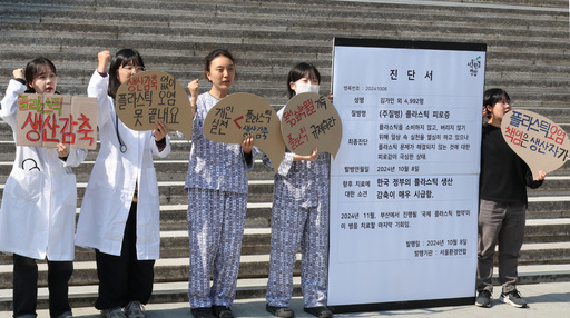 서울환경연합 회원들이 8일 서울 광화문 세종문화회관 계단 앞에서 정부와 기업의 플라스틱 생산 감축을 촉구하고 있다. 이들은 시민 72%가 플라스틱 문제에 대한 무력감·우울 등 ‘플라스틱 피로’를 느끼고 있다는 설문조사 결과를 제시하면서, 11월 부산에서 열리는 국제플라스틱협약을 계기로 정부의 기조 변화를 요구했다.