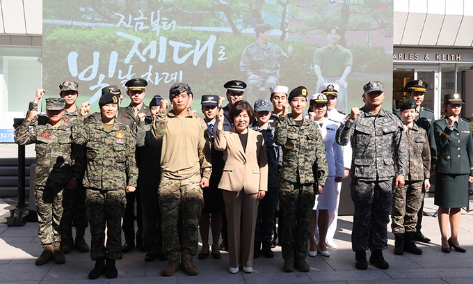강정애 국가보훈부 장관(앞줄 가운데)이 8일 서울 강남구 코엑스 밀레니엄 광장에서 열린 ‘2024년 제대군인 주간’(10월7∼11일) 행사의 개막 선포식에서 밀리터리 서바이벌 예능 프로그램인 ‘강철부대’ 출연진 및 제대군인 모델들과 함께 기념 촬영을 하고 있다. 제대군인 주간은 매년 10월 둘째 주로 지정되며, 제대군인 격려와 함께 취업과 창업 등을 지원하는 행사다.