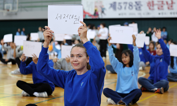“내가 한국어 퀴즈왕” 입력 : 2024-10-08 21:17:58 수정 : 2024-10-08 21:44:51 구글 네이버 유튜브 [대구=뉴시스] 이무열 기자 = 제578돌 한글날 기념 한국어 퀴즈대회가 열린 8일 대구 달서구 계명대학교 성서캠퍼스 체육관에서 외국인 유학생들이 받아쓰기 문제를 풀고 있다. 2024.10.08. lmy@newsis.com 제578돌 한글날을 하루 앞둔 8일 대구 달서구 계명대학교 성서캠퍼스 체육관에서 ‘한국어 퀴즈대회’에 참가한 한 외국인 유학생이 한글을 창제한 세종대왕을 받아쓰라는 퀴즈를 듣고 ‘세정대원’이라는 오답을 들어보이고 있다. <뉴시스>뉴시스> Copyright ⓒ 세계일보. 무단 전재 및 재배포 금지 뉴시스