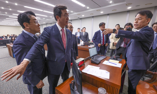 8일 정부세종청사에서 열린 국회 정무위원회 국정감사에서 정승윤 국민권익위원회 부위원장의 ‘야당 의원 고발’ 발언을 두고 국민의힘 소속 윤한홍 정무위원장(오른쪽 첫 번째)에게 강하게 항의하는 더불어민주당 천준호 의원(왼쪽 첫 번째)을 국민의힘 강민국 의원(왼쪽 두 번째)이 제지하고 있다.