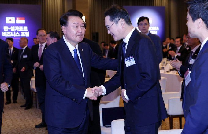 [포토] 이재용 회장과 인사 나누는 윤석열 대통령 입력 : 2024-10-08 22:42:16 수정 : 2024-10-08 22:42:15 싱가포르=남정탁 기자 jungtak2@segye.com 구글 네이버 유튜브 싱가포르를 국빈 방문 중인 윤석열 대통령이 8일 싱가포르의 한 호텔에서 열린 한-싱 비즈니스포럼에 참석해 축사를 마치고 행사장을 나서며 이재용 삼성전자 회장과 인사를 하고 있다. 남정탁 기자 Copyright ⓒ 세계일보. 무단 전재 및 재배포 금지 세계일보 남정탁