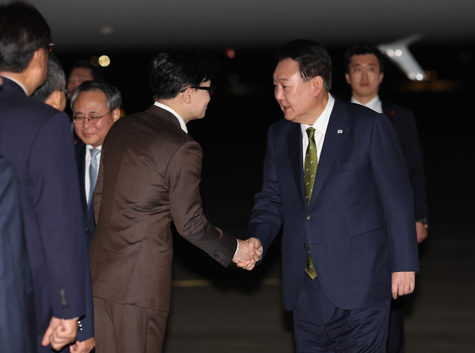 윤석열 대통령이 11일 동남아 3국 순방을 마치고 귀국했다. 윤 대통령은 공항에 마중 나온 국민의힘 한동훈 대표와 악수하며 인사를 나눴다.