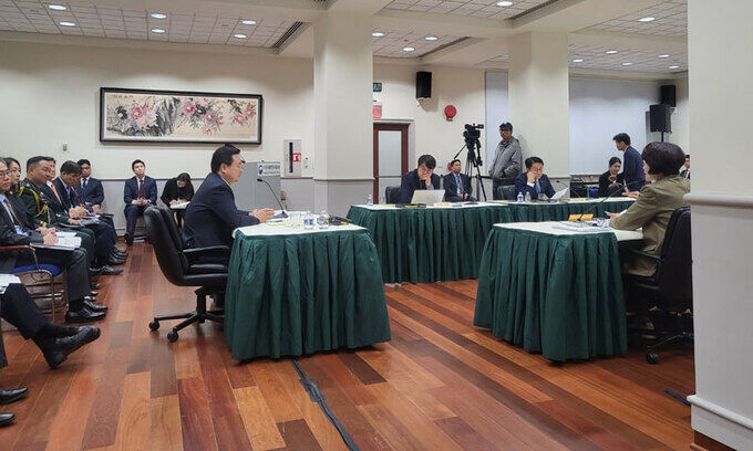 11일(현지시간) 미국 워싱턴 주미한국대사관에서 열린 국회 외교통일위 국정감사에서 조현동 주미대사(왼쪽)가 여야 의원들의 질의에 답변하고 있다. 홍주형 특파원