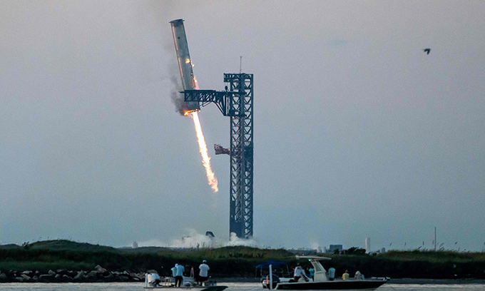 슈퍼헤비 로켓은 지상에 가까워지면서 엔진을 재점화해 역추진하는 방식으로 속도를 급격히 줄인 뒤 서서히 수직으로 하강하다 방향을 살짝 조정해 발사탑에 설치된 젓가락 모양의 두 로봇팔 사이에 정확하게 들어갔다.
