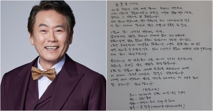 이어 “육십간지가 한 바퀴 돌아 지금 나이에 이르러 부끄럽지만, 처음으로 주연을 맡은 영화를 완성했다"며 "개봉을 앞두고 기자님의 참석을 간청드린다”고 덧붙였다.