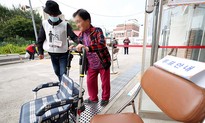 거동이 불편한 일부 유권자는 노인용 보행기나 지팡이에 몸을 의지하거나 가족들의 부축을 받으며 투표소를 찾았다.