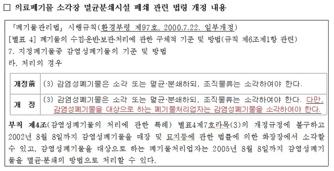 앞서 환경부는 지난달 26일 의료기관에서 배출되는 의료폐기물을 의료기관 내에서 처리할 수 있도록 멸균분쇄시설 처분능력을 현행 100㎏/h 이상에서 30㎏/h 이상(투입량 기준)으로 시설 기준을 완화하는 내용의 폐기물관리법령 개정안을 입법예고했다.