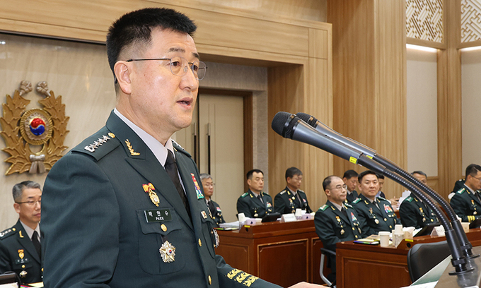 17일 충남 계룡대에서 열린 국회 국방위원회의 육군본부에 대한 국정감사에서 박안수 육군참모총장이 업무현황을 보고 있다. 뉴시스