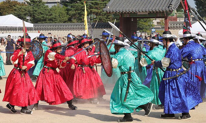 “국왕 행차요”… 궁궐 호위군 사열의식 재현 입력 : 2024-10-17 21:46:28 수정 : 2024-10-17 22:55:25 이재문 기자 구글 네이버 유튜브 17일 서울 종로구 경복궁 흥례문 앞에서 궁궐 호위군 사열의식인 ‘첩종’ 행사가 열리고 있다. 궁궐 호위군 사열의식인 첩종은 국왕의 행차와 사열을 위한 진법과 연무를 극 형식으로 재현한 행사다. 이재문 기자 Copyright ⓒ 세계일보. 무단 전재 및 재배포 금지 세계일보 이재문