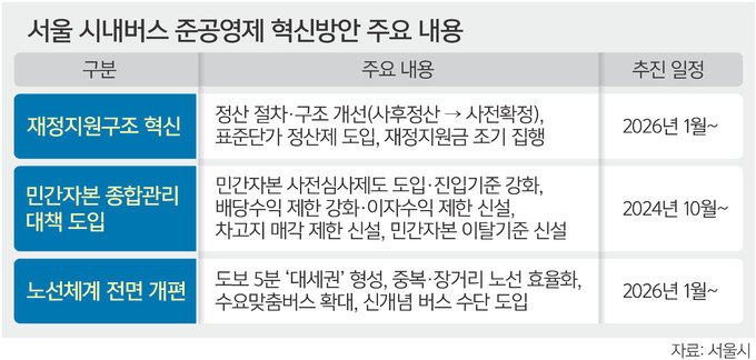 시는 지난 1월부터 이번 혁신방안을 놓고 서울버스조합 등 관계자들과 협의를 이어왔다. 민간자본 종합관리대책은 이달부터, 노선 개편과 사전확정제 실시를 위한 제도 정비는 내년부터 추진한다. 노선 개편은 2026년 1월부터 시행을 목표로 설정했다. 오 시장은 “버스 준공영제 20년을 맞아 재정, 공공성, 서비스 세 가지 혁신 달성으로 시민이 일상에서 편리함을 느끼고 만족할 수 있는 든든한 교통복지를 실현하고, 이를 통해 세계 최고 수준의 시내버스로 자리매김하겠다”고 말했다.