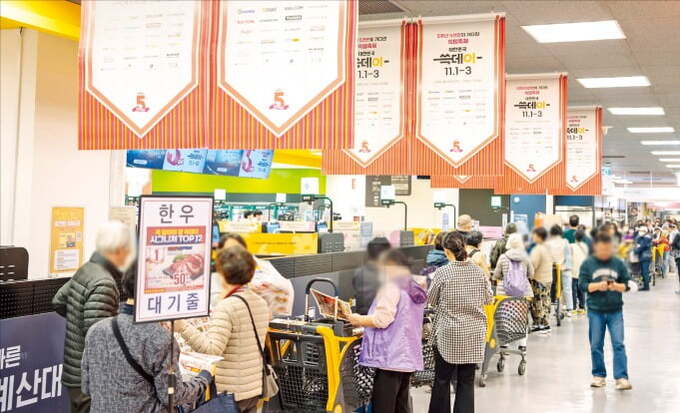 신세계그룹의 최대 세일 행사 '쓱데이' 첫날인 1일 전국 이마트 매장에 사람들이 밀려들었다. 이마트 용산점에 한우를 사려는 고객들이 줄 서 있다. 이마트 제공