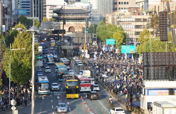 이날 민주당 집회 현장에는 주최 측 추산 약 30만명, 경찰 추산 약 1만7000명이 참가했다. 이들이 집회를 벌이는 동안 서울역에서 광화문으로 향하는 차도는 정체를 빚었다. 인근 보행로는 이곳을 서둘러 빠져나가려는 시민들과 집회 참가자들이 뒤엉키며 혼잡한 양상을 보였다. 시민 김모(24)씨는 “사람들에 끼어서 오도 가도 못하는 바람에 집회 장소를 지나는 데 30분은 걸린 것 같다”고 말했다.