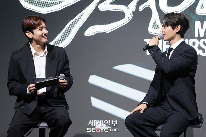 가수 최강창민(사진 왼쪽)과 민호가 4일 서울 여의도 페어몬트 앰배서더 서울에서 열린 그룹 샤이니 민호의 첫 정규 앨범 '콜 백(CALL BACK)' 기자간담회에 참석해 대화를 나누고 있다.