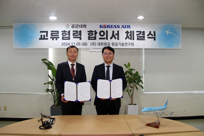 대한항공은 공군대학과 ‘국방정책 및 국방기술분야 교류 협력을 위한 합의서’ 양해각서(MOU)를 맺었다고 6일 밝혔다. MOU 체결식은 전날 오후 대전시 유성구 대한항공 항공기술연구원에서 열렸다.