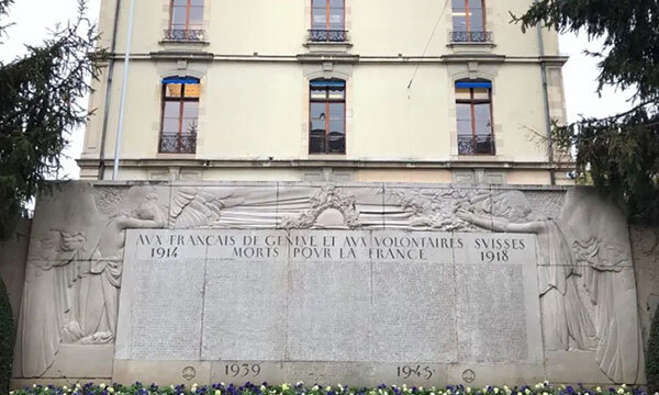 스위스 제네바에 있는 1차대전 기념비. 프랑스군 소속으로 싸우다가 전사한 스위스인들을 추모하기 위한 조형물이다. 뒤의 건물은 제네바 주재 프랑스 영사관. 스위스인포(Swissinfo) 홈페이지
