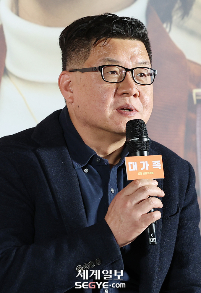 양우석 감독이 12일 오전 서울 롯데시네마 건대점에서 열린 영화 ’대가족’의 제작보고회에 참석해 인사말을 하고 있다.