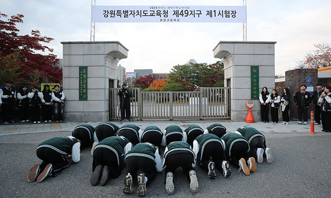 “선배님들 수능 대박 나세요” 입력 : 2024-11-14 18:55:52 수정 : 2024-11-14 18:55:51 구글 네이버 유튜브 2025학년도 대학수학능력시험이 실시된 14일 강원 춘천시 춘천고등학교 정문 앞에서 수험생 후배들이 ‘수능 대박’을 기원하는 큰절을 올리고 있다. <연합>연합> Copyright ⓒ 세계일보. 무단 전재 및 재배포 금지 연합
