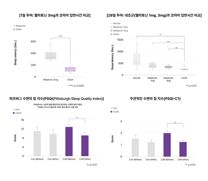 COZA는 멜라토닌보다 2.6배 빠르게 입면 시간을 단축했고, 위와 같은 결과는 단기와 장기 투여 모두에서 일관되게 나타났다. 연구팀은 “COZA가 멜라토닌 없이도 효과적으로 입면 시간을 단축할 수 있다는 점은 매우 고무적”이라고 평가하였다. 또 “멜라토닌 섭취로 인한 부작용이나 의존성 걱정 없이 수면의 질을 개선할 가능성을 제시할 수 있다”라고 전했다.