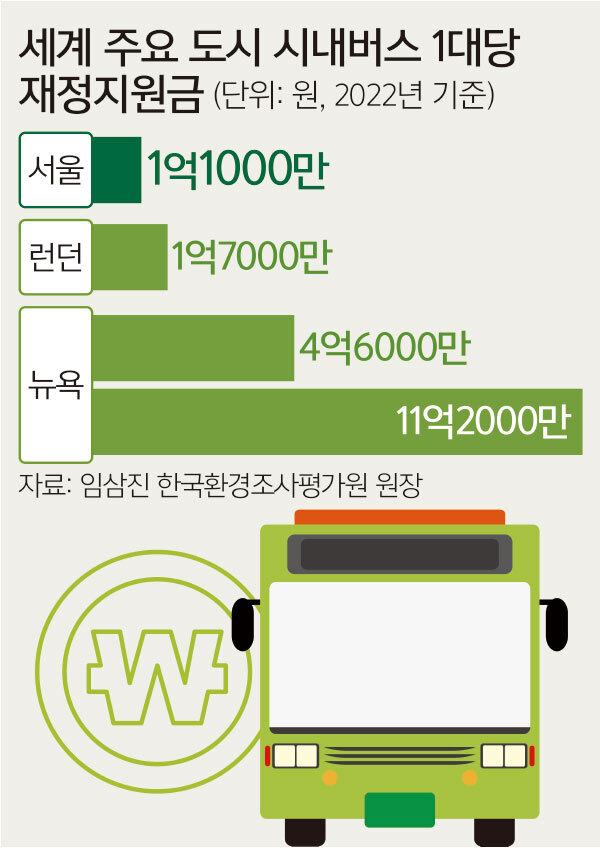 임삼진 한국환경조사평가원 원장은 대한교통학회가 18일 서울 중구 한국프레스센터에서 개최한 ‘서울 시내버스의 재정지원제도 개선 방안’ 정책토론회에서 2022년 서울 시내버스 1대당 재정지원금은 1억1000만원이라고 전했다. 이 같은 재정지원금은 영국 런던 1억7000만원, 미국 뉴욕 4억6000만원(MTA NYCT)·11억2000만원(MTA Bus Company)과 차이가 컸다. 민영회사였던 MTA Bus Company의 경우 요금을 낮추는 대신 뉴욕시로부터 많은 재정지원금을 받고 있다.