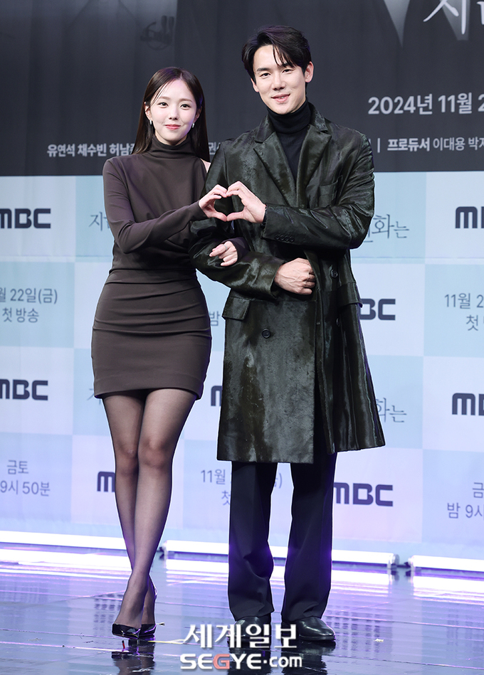 배우 채수빈(사진 왼쪽)과 유연석이 21일 오후 서울 마포구 상암동 MBC 신사옥에서 열린 금토 드라마 ’지금 거신 전화는’의 제작발표회에 참석해 포즈를 취하고 있다.