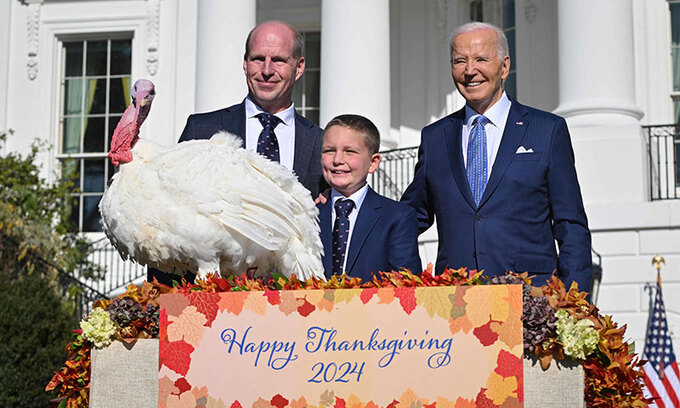 조 바이든 미국 대통령(오른쪽)이 추수감사절을 앞둔 25일(현지시간) 워싱턴 백악관에서 열린 자신의 재임기간 마지막 ‘칠면조 사면’ 행사에서 ‘피치’라는 이름의 칠면조를 사면한다고 선언한 뒤 존 짐머만 미국 칠면조협회 회장(왼쪽), 그의 아들과 기념촬영을 하고 있다. 바이든 대통령은 마지막 추수감사절 칠면조 사면 행사를 주재하면서 “내 평생의 영광이었다. 영원히 감사할 것”이라며 4년 가까운 백악관 생활을 회고했다. 백악관은 이날 바이든 대통령이 내년 1월 개최되는 도널드 트럼프 대통령 당선인의 취임식에 참석할 계획이라고 밝혔다.