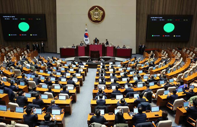 윤석열 대통령이 긴급 대국민 담화를 통해 비상계엄령을 발표한 가운데 4일 서울 여의도 국회 본회의장에서 비상계엄 해제 요구 결의안이 가결되고 있다. 뉴시스