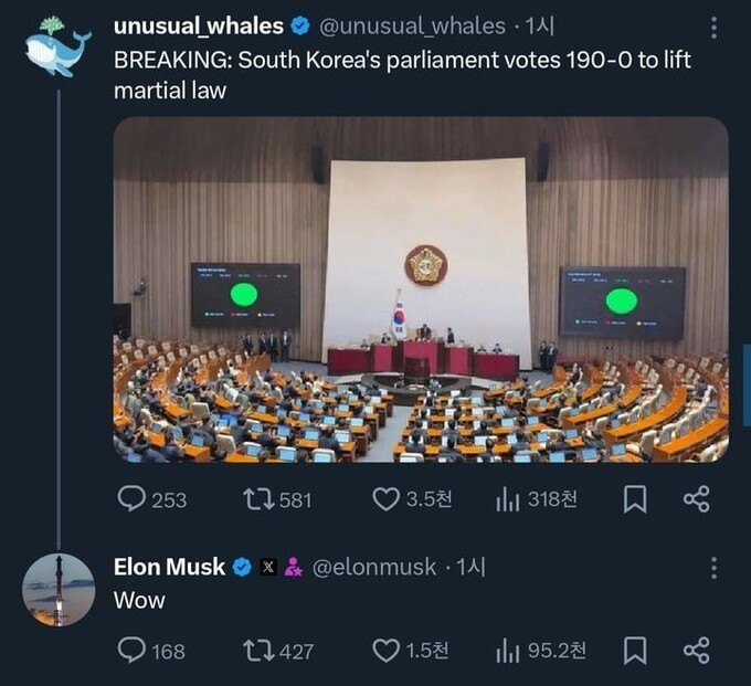 머스크는 4일 소셜미디어에 한국 국회가 재적 190인 만장일치로 계엄령 해제 결의안을 통과했다는 한 게시글을 공유하면서 “와우(Wow)”라고 반응했다. 그러면서 한국 상황과 관련해 다른 게시글로 “이는 정말 충격적이다”라고 덧붙였다.