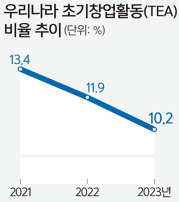 초기창업활동 비율은 2021년 13.4%, 2022년 11.9%로 매년 낮아지고 있다. 순위도 21위에서 22위, 지난해 30위로 떨어졌다.