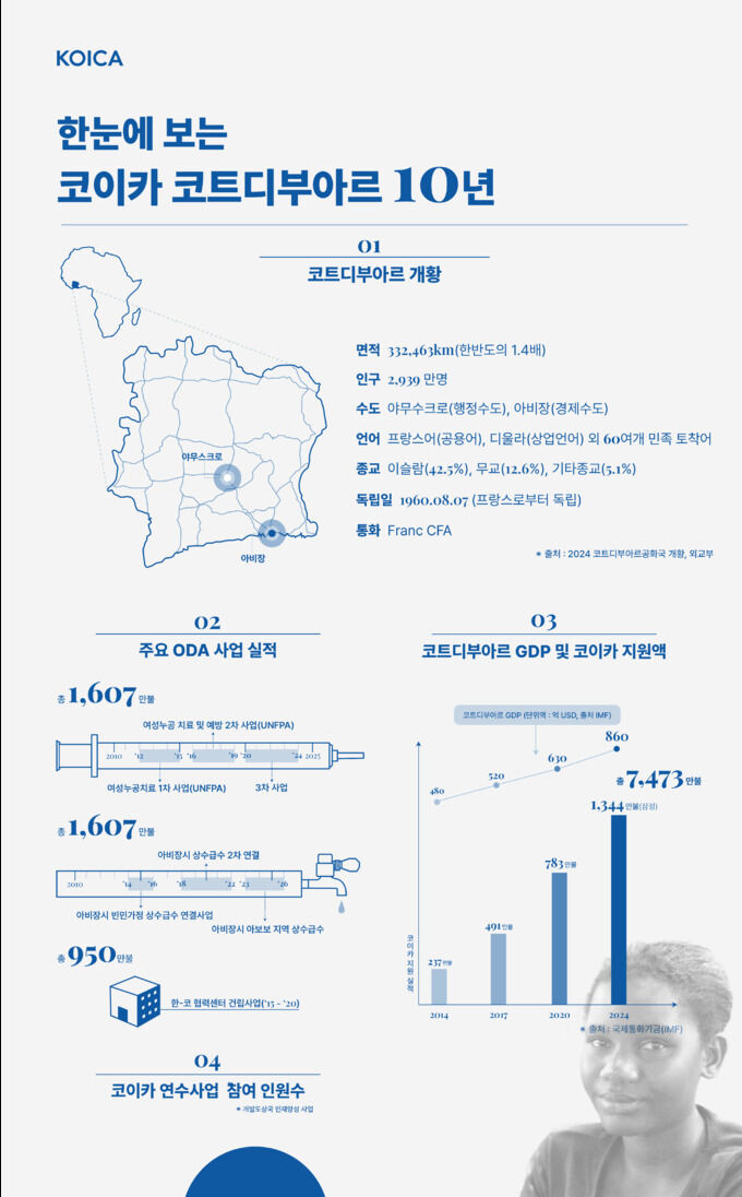 코이카는 2014년 코트디부아르에 사무소를 개소해 공적개발원조(ODA) 사업을 본격적으로 추진해 왔다. 지난 10년 간 코이카를 통한 무상 ODA 지원액은 6배 이상 증가(‘14년 237만불→’24년(잠정)1,344만불)했으며, 코이카 연수사업에 참여한 인재들도 누적 401명에 달한다. 같은 기간 동안 코트디부아르의 국내총생산(GDP)은 2배 이상 증가(‘14년 480억불→850억불)*했다.