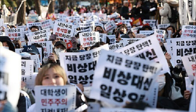 탄핵소추안 표결이 이뤄지는 7일 전국 31개 대학교 학생이 국회 인근에서 윤석열 대통령 퇴진을 촉구했다.