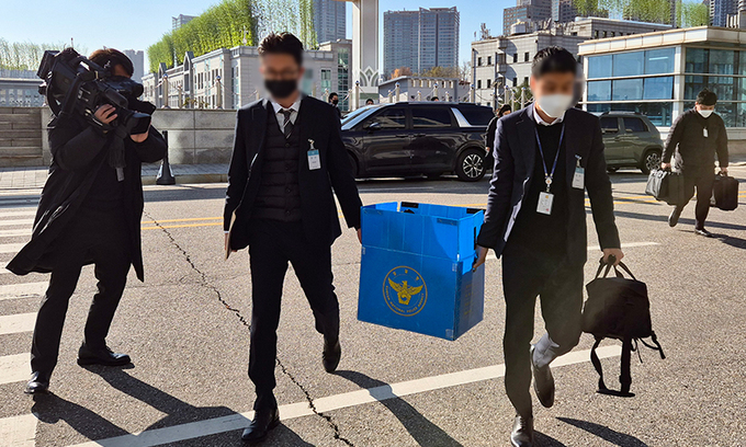 경찰 국가수사본부(국수본) 관계자들이 8일 ‘12·3 비상계엄 사태’를 주도한 것으로 지목된 김용현 전 국방부 장관의 집무실을 압수수색하기 위해 서울 용산 국방부 청사로 들어가고 있다. 연합뉴스