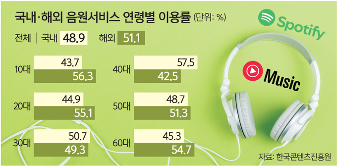 “해외 음원 서비스 주로 쓴다” 51%…국내 플랫폼 이용률 처음으로 추월