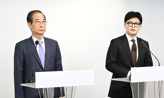 한 대표는 어제 담화에서 “질서 있는 대통령의 조기 퇴진”을 약속했다. 이 정도 언급으로 정국이 진정될지는 의문시된다. 당장 우원식 국회의장이 어제 “그 누구도 부여한 바 없는 대통령의 권한을 총리와 여당이 공동 행사하겠다고 하는 것은 명백한 위헌”이라고 했다. 야당도 반발했다. 더불어민주당 이재명 대표는 “총리와 여당 대표가 국정을 맡겠다는 것은 2차 내란 행위”라고 주장했다. 한 대표가 몇 번이나 오락가락 한 것도 국민의 신뢰를 떨어뜨리는 대목이다. 처음엔 탄핵 반대 당론에 뜻을 같이했다. 그러다 다시 탄핵 찬성으로 입장을 바꿨고, 어제는 조기 퇴진을 언급했다. 한 총리도 계엄 선포를 위한 국무회의에 참석했다는 점에서 논란이 커지고 있다.