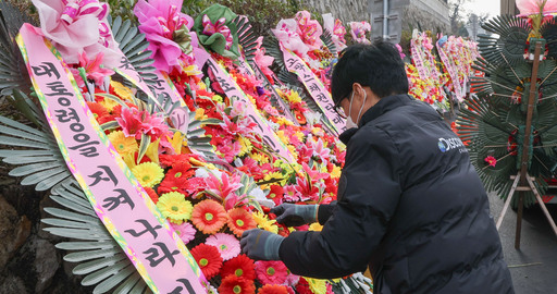 11일 오후 12시 기준 서울 용산구 대통령실·국방부 청사 앞에는 윤 대통령을 지지하는 화환 40여개가 줄지어 놓여졌다. 전날 저녁까지만 해도 없었던 화환들로, 이날 오전부터 배달되기 시작했다.