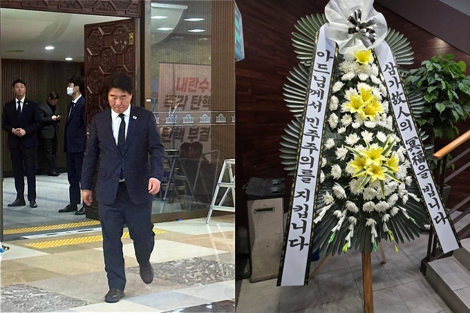 이 의원은 “열흘 넘는 국회 비상대기로 의원회관 소파에서, 본회의장 책상 아래에서 선잠을 자면서도 병환 중인 아버지 곁에 머무르지 못하는 것이 자식 된 마음에 무겁고 죄스러웠다”며 “이른 아침 마지막 가시는 길을 보고 오후 탄핵 표결을 마치고 돌아왔을 때 조화를 발견하고 큰 위로를 받은 듯 울컥했다”고 전하기도 했다. 이 의원이 올린 사진에는 ‘아드님께서 민주주의를 지킵니다. 삼가 고인의 명복을 빕니다’라는 문구가 적힌 조화가 담겼다.