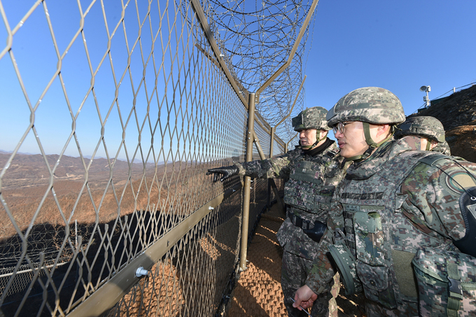 김명수 합참의장(왼쪽)이 17일 중부전선 최전방 감시소초(GP)를 순시하면서 경계태세를 점검했다. 김 의장의 GP 현장 방문은 지난해 12월 이후 1년 만이다. 12·3 비상계엄 사태 이후 군 주요 지휘관 구속 등에 따른 우려를 불식시키기 위한 행보로 풀이된다. 합참에 따르면, 이날 김 의장은 중부전선을 담당하는 강원 화천군 소재 제15사단 사령부를 방문해 군사대비태세 현황을 보고받고 “사단장을 중심으로 대비태세 유지에 만전을 기하라”고 지시했다. 김 의장은 15사단 예하 부분 복원이 완료된 GP를 찾아 감시·경계작전체계를 점검했다.