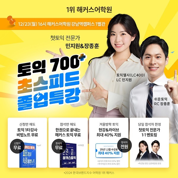 해커스어학원 ‘토익 700+ 초스피드 졸업특강’은 오는 12월 23일(월) 해커스어학원 강남역캠퍼스 1별관 104호에서 진행될 예정이며, 첫토익 전문가 LC 민지원, RC 장종훈 강사가 연사로 나선다.