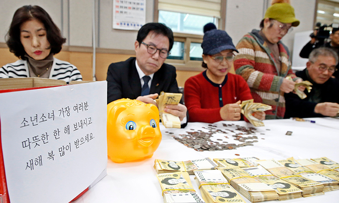 그가 말한 곳에는 A4 용지 상자 하나가 놓여 있었고 안에는 오만원권 현금다발과 황금색 돼지저금통이 들어있었다. ‘소년·소녀 가장 여러분, 따뜻한 한 해 보내시고 새해 복 많이 받으세요’라고 적힌 편지도 함께 있었다. 금액을 세어보니 총 8003만8850원이었다.