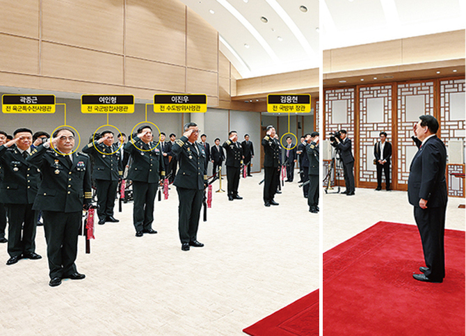 윤 대통령은 이번 비상계엄 사태와 관련해 수사 선상에 오른 곽종근(육사 47기) 전 육군 특수전사령관, 이진우(육사 48기) 전 수도방위사령관, 여인형(충암고 17회·육사 48기) 전 국군방첩사령관 등을 각각 소장에서 중장으로 승진시키고 해당 보직에 임명했다. 진급 행사에는 당시 경호처장이던 김용현 전 국방장관도 배석했다.