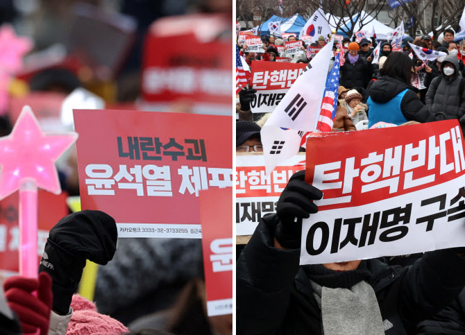 이날 오후 헌법재판소가 있는 종로 일대에는 촛불행동, 대통령 퇴진비상행동 집회·행진, 민주노총 집회·행진 등이 개최됐고, 이들과 반대되는 성격의 자유통일당 집회가 광화문역과 시청역 근처에서 벌어졌다. 약 1km 차이로 완전히 다른 외침이 터져나왔다. 광화문에는 이번 퇴진 집회의 상징이 된 응원봉을 든 이들과 태극기를 든 이들로 갈라진 풍경이 연출됐다.
