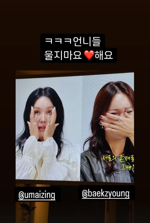 엄정화는 당시가 생각나 울컥했다. 엄정화는 "맞다. 그때는 어떤 마음인지 아니까. 그때의 전화가 힘이 됐다. 너의 마음도 느껴졌다. 그러면서 우리가 울었다"며 갑작스레 눈시울을 붉혔다. 백지영도 "저는 그때 언니의 존재가 힘이 됐다"며 함께 눈물을 보였다.