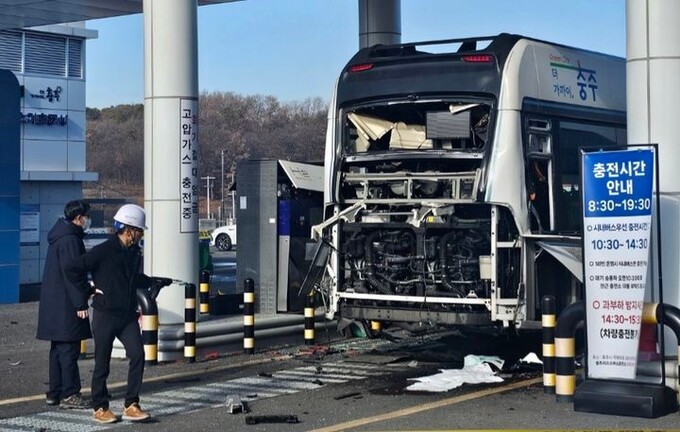 차체 결함으로 정비 예정이었던 수소 시내버스가 충전소에서 폭발해 3명이 다쳤다.