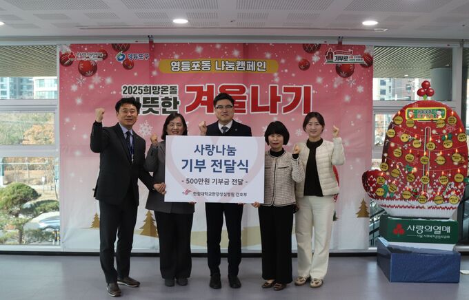 병원은 지난 11일 서울 영등포구 영등포동 주민센터에서 열린 ‘따뜻한 겨울나기’ 기부행사에 참여해 500만 원을 기부했다. 행사에는 한림대학교한강성심병원 최종길 행정부원장, 이미화 간호부장, 박호민 총무관리팀장 등이 참석했다.
