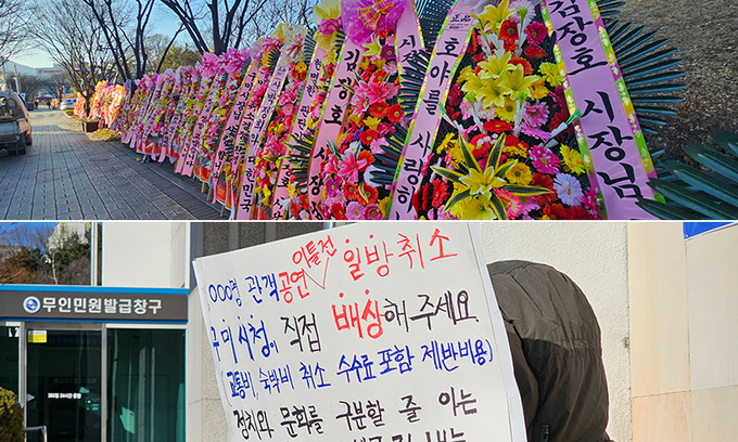 경북 구미시가 이승환 콘서트 대관을 취소하자 24일 대관 취소를 지지하는 100여개의 격려 화환이 구미시청에 배달돼 정문앞에 늘어서 있다. 아래쪽 사진은 수원에서 온 한 50대 여성이 24일 구미시청사 앞에서 공연 이틀전 일방 취소 구미시청이 직접 배상해 달라며 1인 시위를 벌이는 모습. 뉴스1
